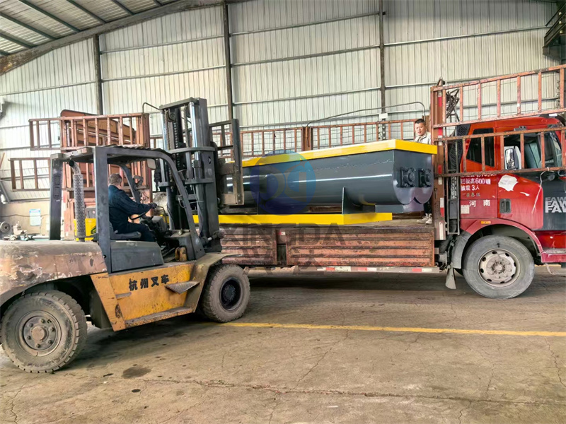 一台正在装车的1.2米有机肥双轴搅拌设备准备出发:该系列搅拌机是我公司研制的新一代混合设备,该机混合度高,残留量少,适合于两种以上肥料,添加剂预混料得混合,及配合饲料、浓缩饲料、添加剂预混饲料等的混合。双轴搅拌机利用两根呈对称状的螺旋轴的同步旋转,双轴搅拌机内装有旋转反向的浆叶,浆叶成一定角度将物料沿轴向、径向循环翻搅,使物料迅速混合均匀。